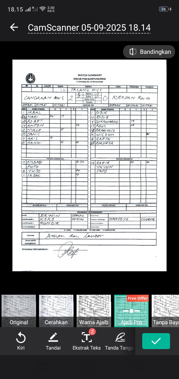 5 Sep 2025-4:00 pm KADES CUP 1 DESA GENTENG WETAN 2025 - PENYISIHAN Half Time: - RW 10 KRAJAN 0 0 : 2 RW 05 CANGA'AN 2 Full Time Erwin Sofyan Referees Referee: Erwin Sofyan Assistant Referee 1: Muh Mundir Assistant Referee 2: Koko Komarudin Gallery